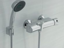 Внимания заслуживает устройство Precision Start от производителя Grohe. Монтируемое на стену устройство с респектабельной встроенной поверхностью имеет стопор безопасности при повышении температуры порядка 38С, систему экономичного расхода воды и керамический клапан. Устройство полностью безопасно (имеет защиту от обратного тока) и прослужит долгие годы (во многом благодаря клапану из керамики и наличию грязеочистительных фильтров). Термостат оснащен коротким изливом, отверстием для подсоединения шланга душа.