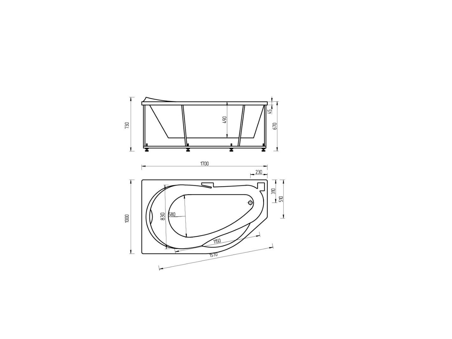 Длина, см:170Ширина, см:100Высота, см:67–77Глубина, см:49Форма:АсимметричнаяВнутр. размер дна, см:115Внутр. размер ванны, см:157Внутренняя ширина, см:83Макс. емкость, л:270Вес, кг:45