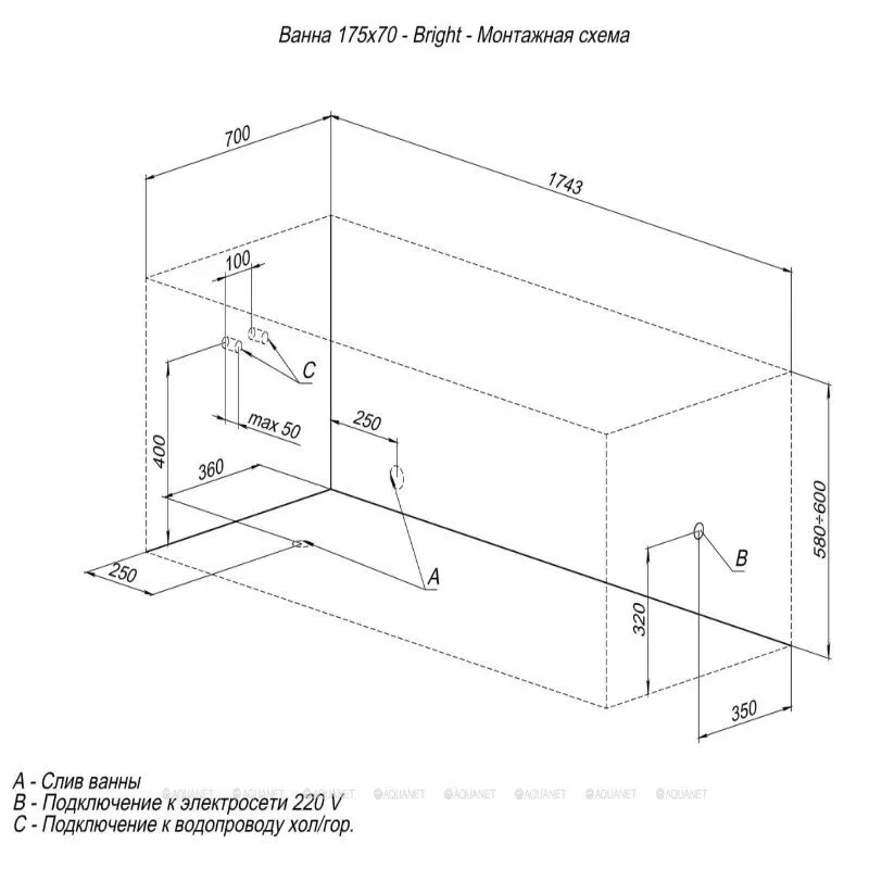 Акриловая ванна Aquanet Bright 175x70 создана с учетом растущего спроса на ванны простой прямоугольной формы в популярных размерах. Это модель с прямыми бортами и пологой спинкой, где соблюден идеальный угол для комфортного нахождения в ванне. Спинка плавно перетекает в бортик, поэтому релакс гарантирован даже без использования подголовника. Все линии ванны подчинены строгим законам эргономики. В современных условиях ширина ванны 70 см при длине 175 см - это наиболее востребованные габариты, так как прекрасно вписываются в стандартную планировку современных ванных комнат. Чаша в этой ванне устроена таким образом, что для обозначенных размеров в ней достигнут максимально возможный внутренний объем, а именно 190 литров, и это при комфортной глубине в 393 мм от слива ванны до борта. Ванна рассчитана на нагрузку свыше 300 кг, так что даже крепкий мужчина сможет без опаски находиться в ней. Двойной слой армирования обеспечивает надежность чаши, а закладные из МДФ-плит в местах наибольшей нагрузки усиливают эффект.