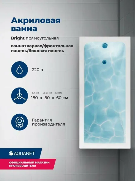 Акриловая ванна Aquanet Bright 180x80 создана с учетом растущего спроса на ванны простой прямоугольной формы в популярных размерах. Это модель с прямыми бортами и пологой спинкой, где соблюден идеальный угол для комфортного нахождения в ванне. Спинка плавно перетекает в бортик, поэтому релакс гарантирован даже без использования подголовника. Все линии ванны подчинены строгим законам эргономики. В современных условиях ширина ванны 80 см при длине 180 см - комфортные габариты, которые, к тому же, прекрасно вписываются в стандартную планировку современных ванных комнат. Чаша в этой ванне устроена таким образом, что для обозначенных размеров в ней достигнут максимально возможный внутренний объем, а именно 220 литров, и это при комфортной глубине в 411 мм от слива ванны до борта. Ванна рассчитана на нагрузку свыше 300 кг, так что даже крепкий мужчина сможет без опаски находиться в ней. Двойной слой армирования обеспечивает надежность чаши, а закладные из МДФ-плит в местах наибольшей нагрузки усиливают эффект.