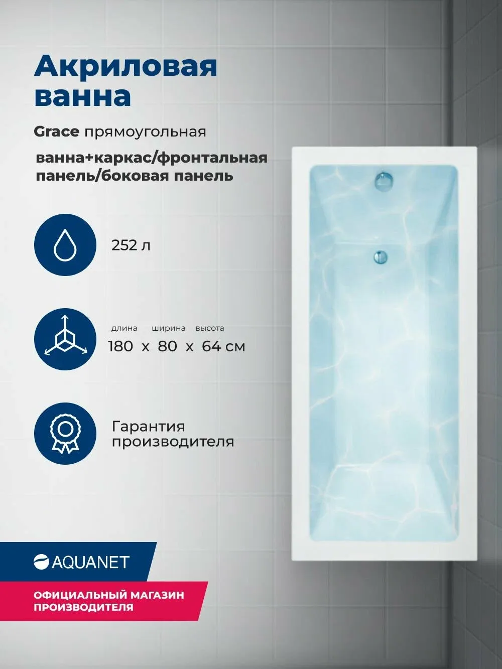 Акриловая ванна Aquanet Grace 347879 180x80 см с каркасом с фронтальной и боковой панелями Акриловая ванна Aquanet Grace 347879 180x80 см с каркасом с фронтальной и боковой панелями Казань 28517.76 39608.00 AQUANET