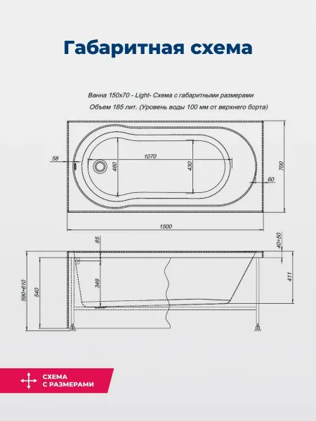 Акриловая ванна Aquanet Light 150x70 занимает особое место в ассортименте компании «Акванет», так как эффектно смотрится как в стандартной планировке, так и в небольшом помещении. У нее эргономичная чаша глубиной 380 мм и широкие борта. На них легко найти место для установки набортного смесителя – популярная в последнее время опция. А если установить на ванну еще и гидромассажное оборудование, аэромассаж и подсветку, то получится настоящий спа-комплекс на дому, куда войдет 185 литров воды.