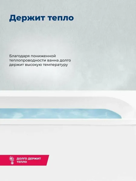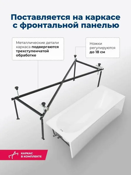 Овальная чаша объемом 150 л со стандартным сливом дополнена расположенной под углом спинкой, переходящей в прямые широкие бортики. Глубина составляет 44,7 см. Выверенная до мелочей эргономика обеспечивает комфортное принятие водных процедур, позволяет держать под рукой необходимые гигиенические принадлежности. Устойчивость придает прочный металлический каркас, оптимальную высоту которого можно подобрать за счет регулируемых ножек.