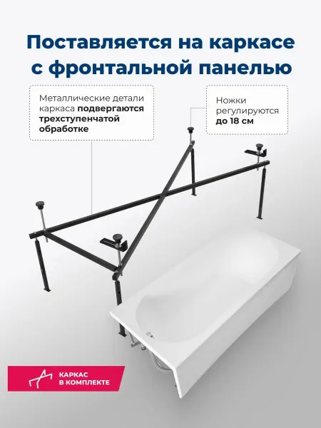 Эргономичный дизайн ванны включает в себя овальную чашу с плавной спинкой и практичными бортиками, где всегда можно разместить необходимые средства гигиены. Металлический каркас с регулируемыми ножками обеспечивает устойчивость и надежность конструкции. Белоснежный цвет и глянцевая поверхность придают ванне современный и стильный вид, который станет украшением любой ванной комнаты.