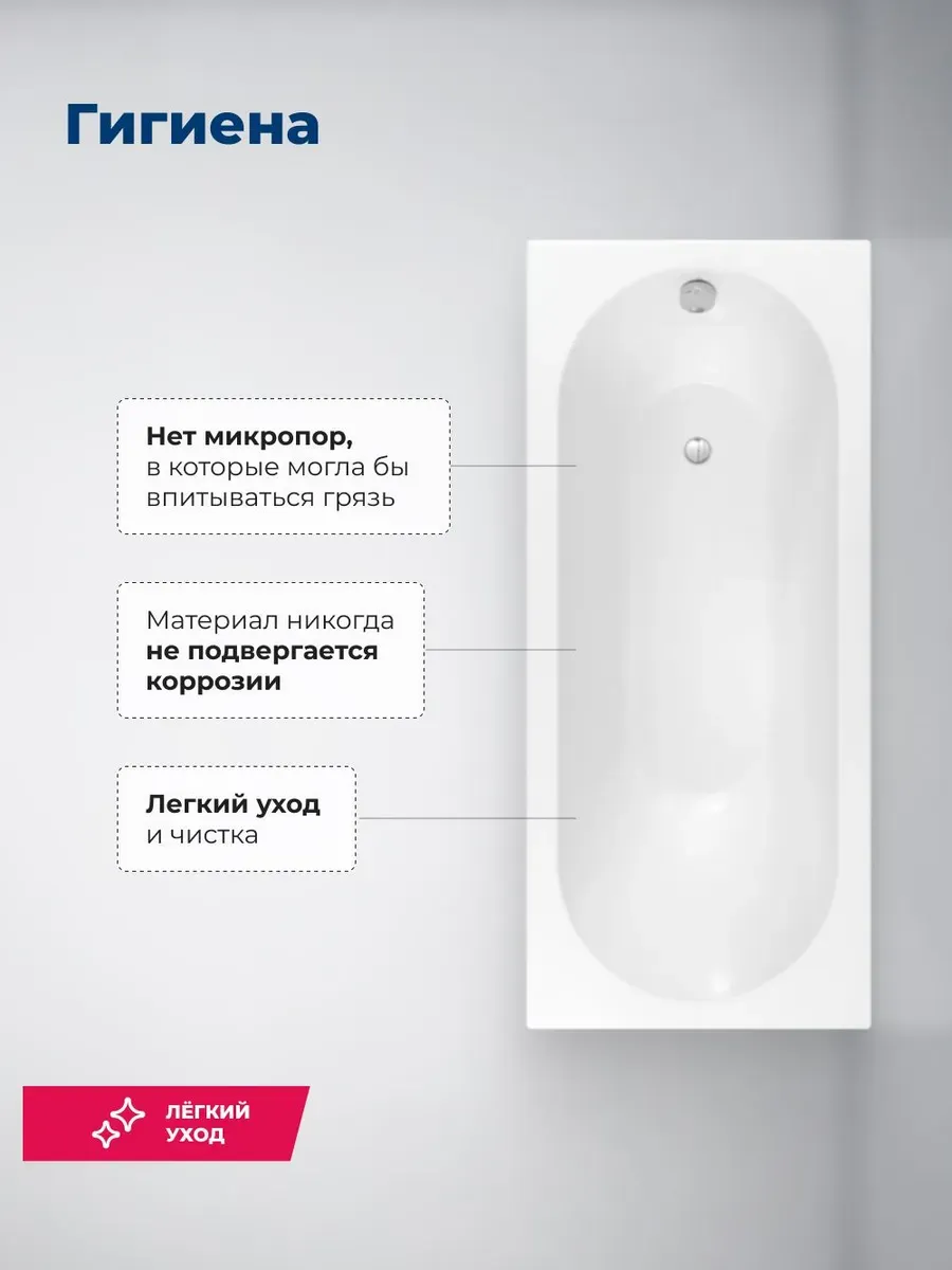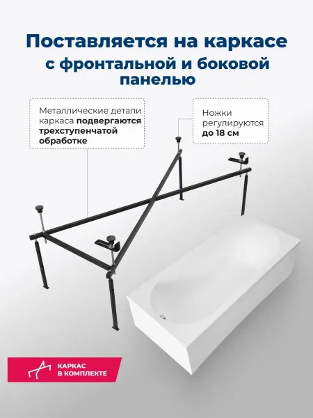 Овальная чаша объемом 215 л со стандартным сливом дополнена расположенной под углом спинкой, переходящей в прямые широкие бортики. Глубина составляет 44 см. Выверенная до мелочей эргономика обеспечивает комфортное принятие водных процедур, позволяет держать под рукой необходимые гигиенические принадлежности. Устойчивость придает прочный металлический каркас, оптимальную высоту которого можно подобрать за счет регулируемых ножек.