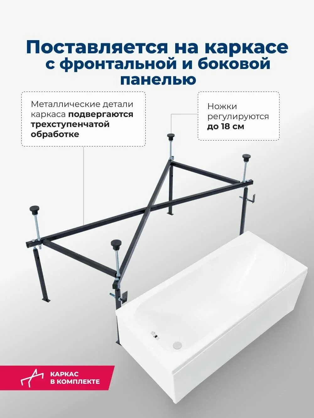 Ванна уже установлена на жесткий сварной каркас из металлического профиля. Металлические детали каркаса подвергаются трехступенчатой обработке, когда сначала профильная труба проходит абразивную зачистку на специальном станке, после чего готовые детали обрабатывают каустической содой, и, просушив, покрывают с помощью электростатического распылителя молотковой краской по металлу. Это гарантирует равномерность окрашивания и стойкость покрытия.