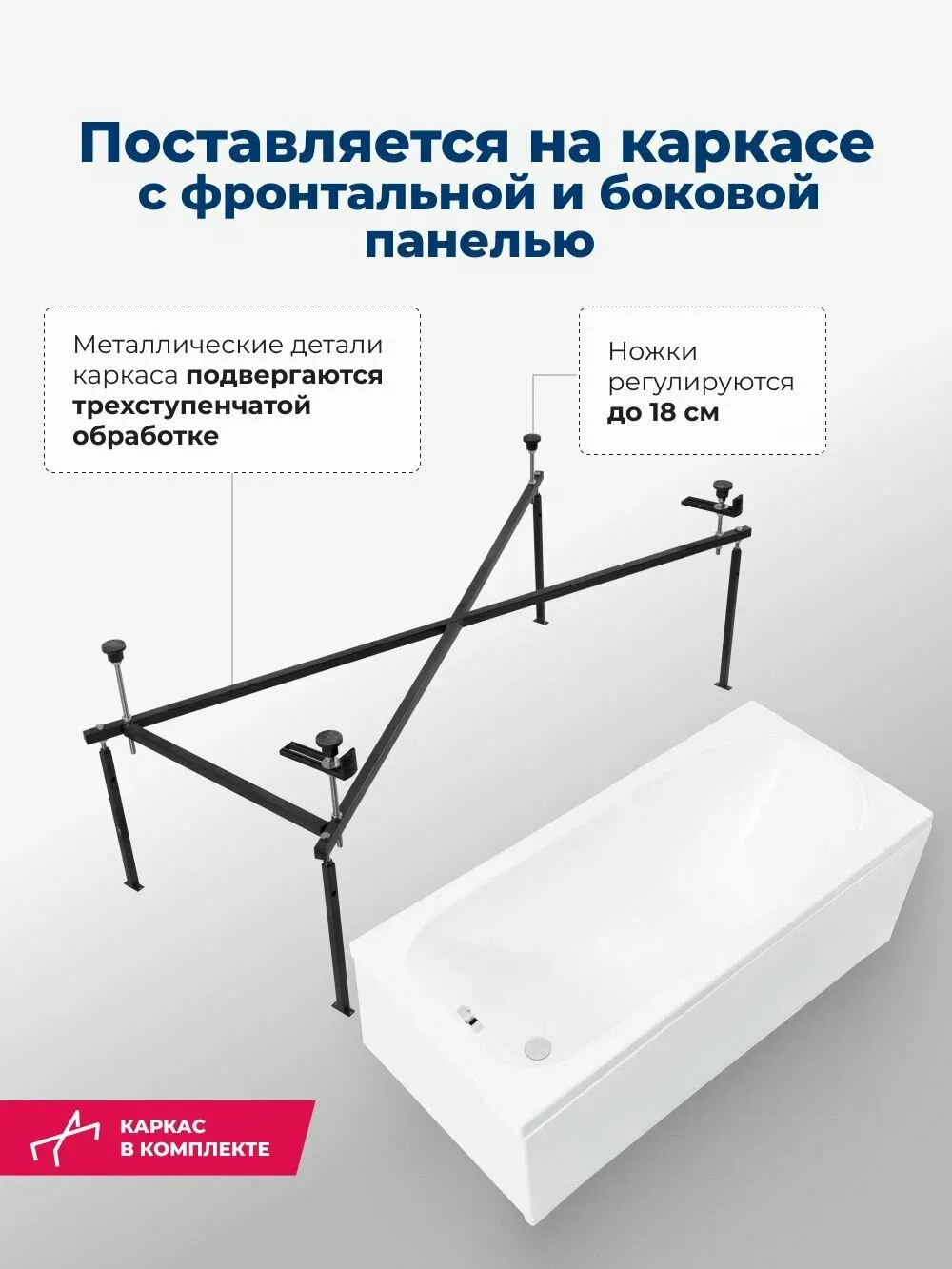 Ванна уже установлена на жесткий сварной каркас из металлического профиля. Металлические детали каркаса подвергаются трехступенчатой обработке, когда сначала профильная труба проходит абразивную зачистку на специальном станке, после чего готовые детали обрабатывают каустической содой, и, просушив, покрывают с помощью электростатического распылителя молотковой краской по металлу. Это гарантирует равномерность окрашивания и стойкость покрытия.