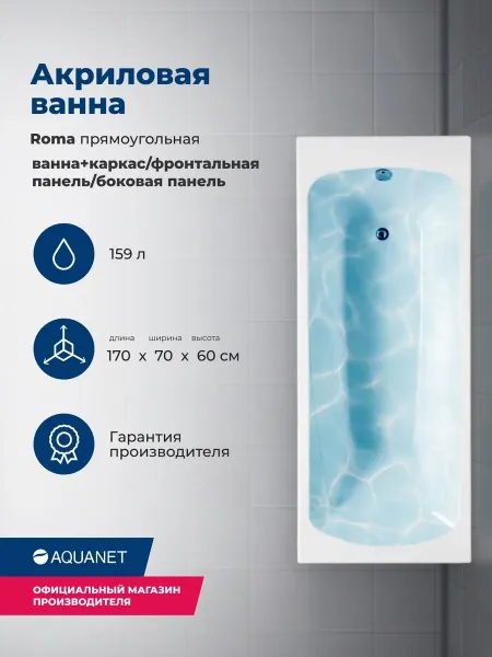 Акриловая ванна Aquanet Roma 347890 170x70 см с каркасом с боковой и фронтальной панелями Акриловая ванна Aquanet Roma 347890 170x70 см с каркасом с боковой и фронтальной панелями Казань 22310.64 30987.00 AQUANET
