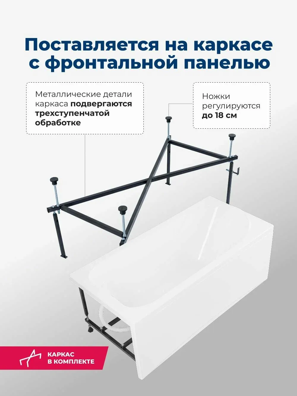 Ванна уже установлена на жесткий сварной каркас из металлического профиля. Металлические детали каркаса подвергаются трехступенчатой обработке, когда сначала профильная труба проходит абразивную зачистку на специальном станке, после чего готовые детали обрабатывают каустической содой, и, просушив, покрывают с помощью электростатического распылителя молотковой краской по металлу. Это гарантирует равномерность окрашивания и стойкость покрытия.