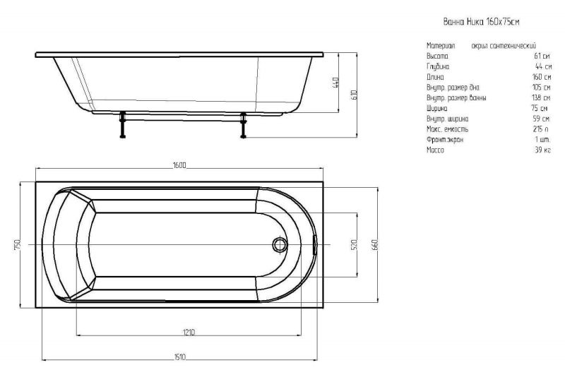 Габариты (Д Ш), см: 160х75Высота с опорой, см: 61Объем, л: 220 Форма: прямоугольнаяМонтаж: пристеннаяРасположение перелива: стандартноеДиаметр слива ванны, см: 5,2Материал: 100% литьевой акрилЦвет: белыйГарантия: 20 летСтрана: Россия Вид опоры: каркас сборно-разборный металлический (шпильки) или опорная конструкция (ножки), приобретается отдельноЭкран: фронтальный и боковой, приобретаются отдельноСлив-перелив: нет, приобретается отдельноНескользкая поверхность