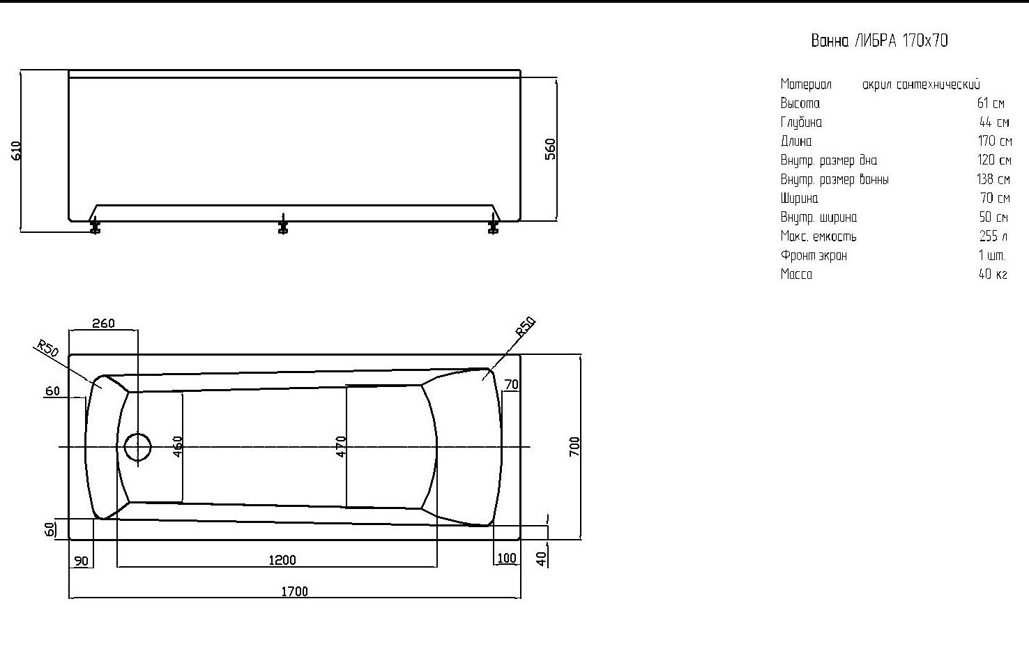 Габариты (Д Ш), см: 170х70Высота с опорой, см: 61Объем, л: 255 Форма: прямоугольнаяМонтаж: пристеннаяРасположение перелива: стандартноеДиаметр слива ванны, см: 5,2Материал: 100% литьевой акрилТолщина акрилового листа, мм: 4Гарантия: 20 летСтрана: Россия Вид опоры: каркас сборно-разборный сварной, есть в комплектеЭкран: фронтальный, в комплектеСлив-перелив: есть, в комплектеАнтискользящее покрытие: нескользкая поверхностьПодголовник: приобретается отдельноРучки: приобретаются отдельно Система гидромассажа: установка по желаниюАэромассаж: установка по желаниюХромотерапия: установка по желаниюРучки, поручни для ванны: установка по желаниюВстроенные смесители: установка по желаниюИзменение конструкции каркаса: установка по желаниюОзонирование: нет, установка не предусмотренаЗащита от сухого пуска: установка по желаниюУправление: любое по желанию
