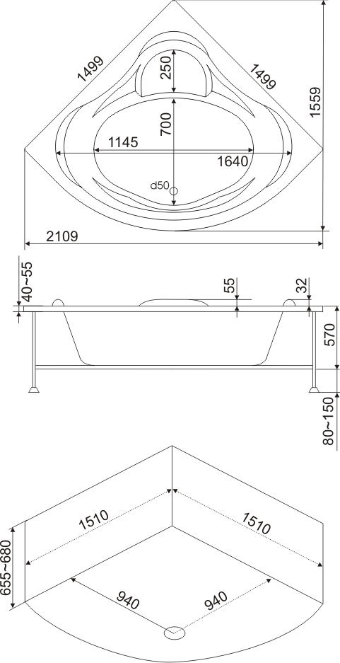 Глубина ванны по центру: 480 мм