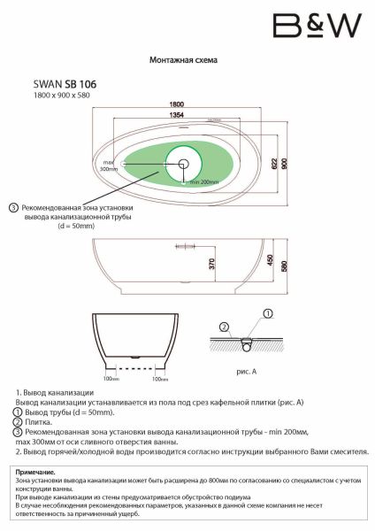 Акриловая ванна Black & White Swan 106SB00 180 x 90 см купить