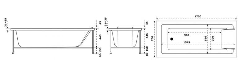 Смягченные углы с внутренней стороны чаши ванны облегчают уход.РАЗМЕРЫ :170 x 70 x 44,50 см