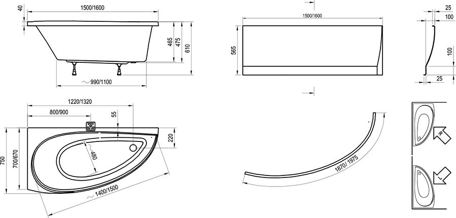 - аксессуары: передняя панель, сточный комплект для ванны