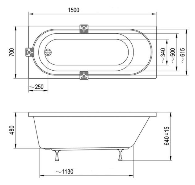 Комплектация: в стоимость входит только ванна, всё остальное, в т.ч. слив-перелив, опора, боковые панели, приобретается отдельно.