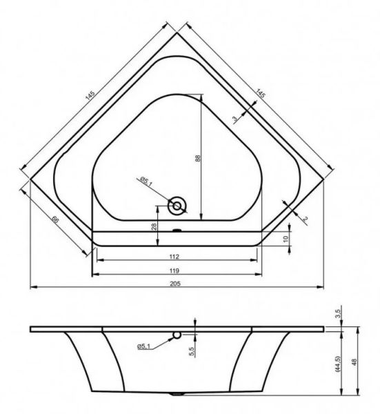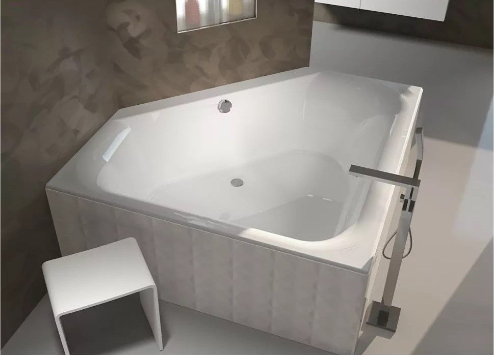 Симметричная угловая ванна RIHO Austin изготовлена из высококачественного листа акрила глянцевого белого цвета.