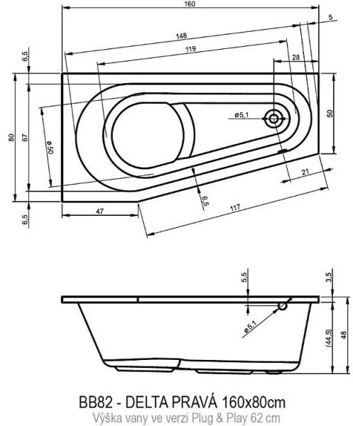Асимметричная ванна RIHO Delta 160x80 R Plug & Play из глянцевого белого акрила, со скошенными краями представляет собой полностью собранную на заводе конструкцию.