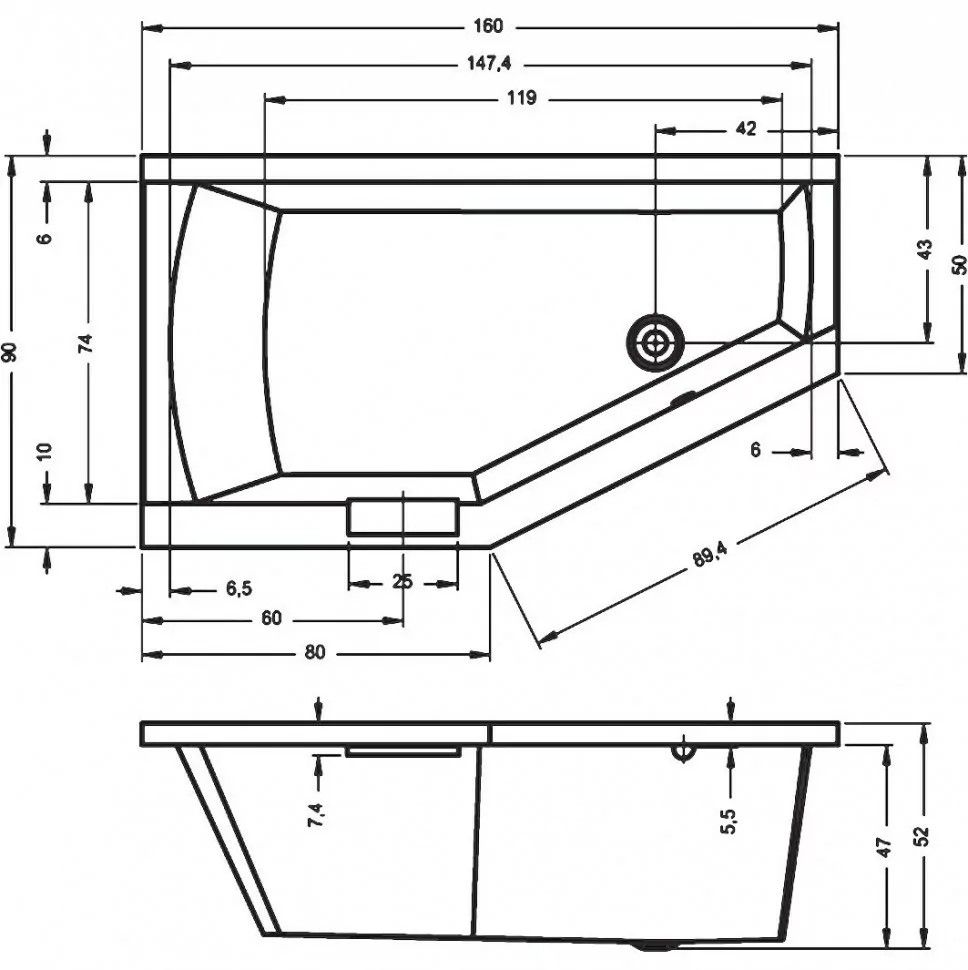 Ванна асимметричная, исполнение правое(R), сливное отверстие справа