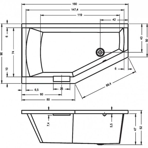 Асимметричная акриловая ванна RIHO Geta 160x90R изготовлена из высококачественного листа акрила глянцевого белого цвета.