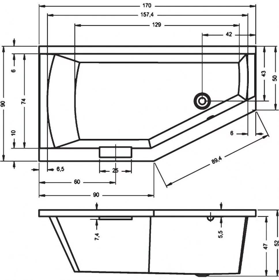 Ванна асимметричная, исполнение правое(R), сливное отверстие справа