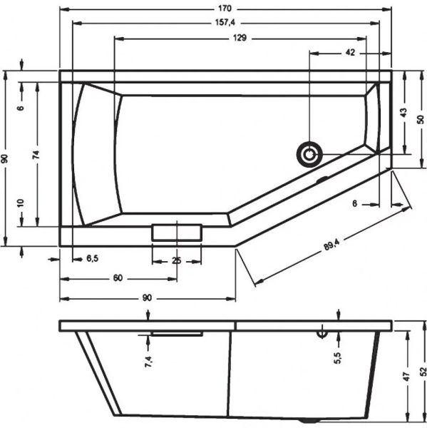 Асимметричная акриловая ванна RIHO Geta 170x90R изготовлена из высококачественного листа акрила глянцевого белого цвета.