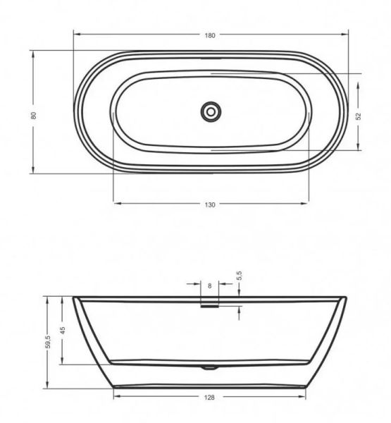 Отдельно стоящая, матовая белая акриловая ванна RIHO Inspire 180х80 с двойными стенками, со встроенным переливом и нажимным донным клапаном.