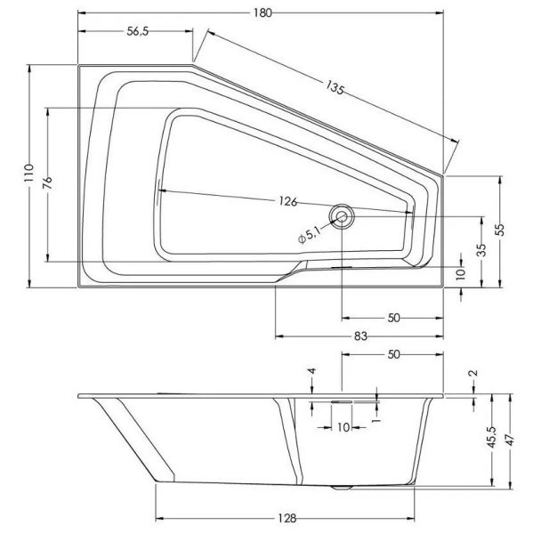 Ванна асимметричная левая, сливное отверстие слева