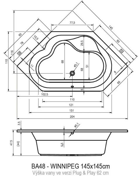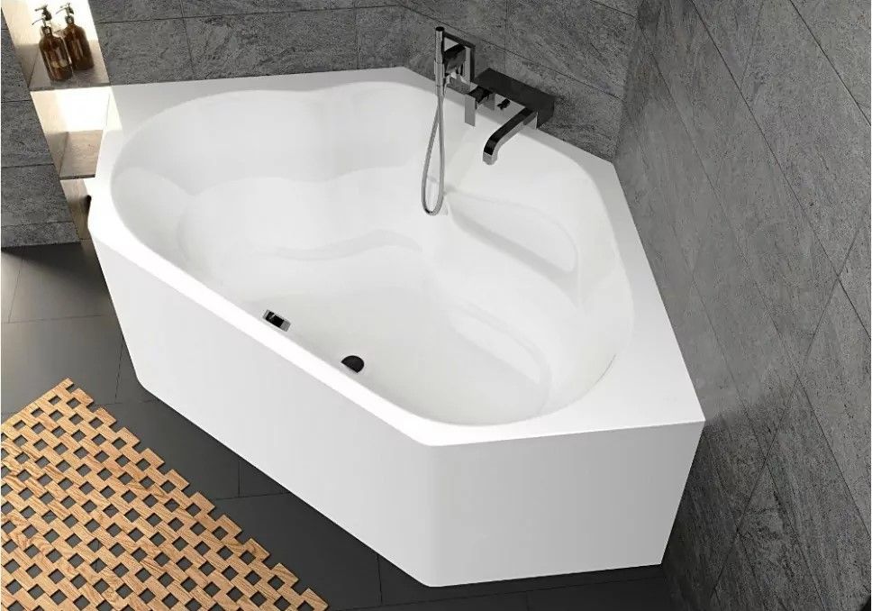 Отдельно стоящая угловая ванна RIHO Winnipeg 145x145 PLUG & PLAY изготовлена из белого глянцевого акрила. имеет оригинальную шестиугольную форму с большим внутренним объёмом, позволяющим принимать комфортные водные процедуры.