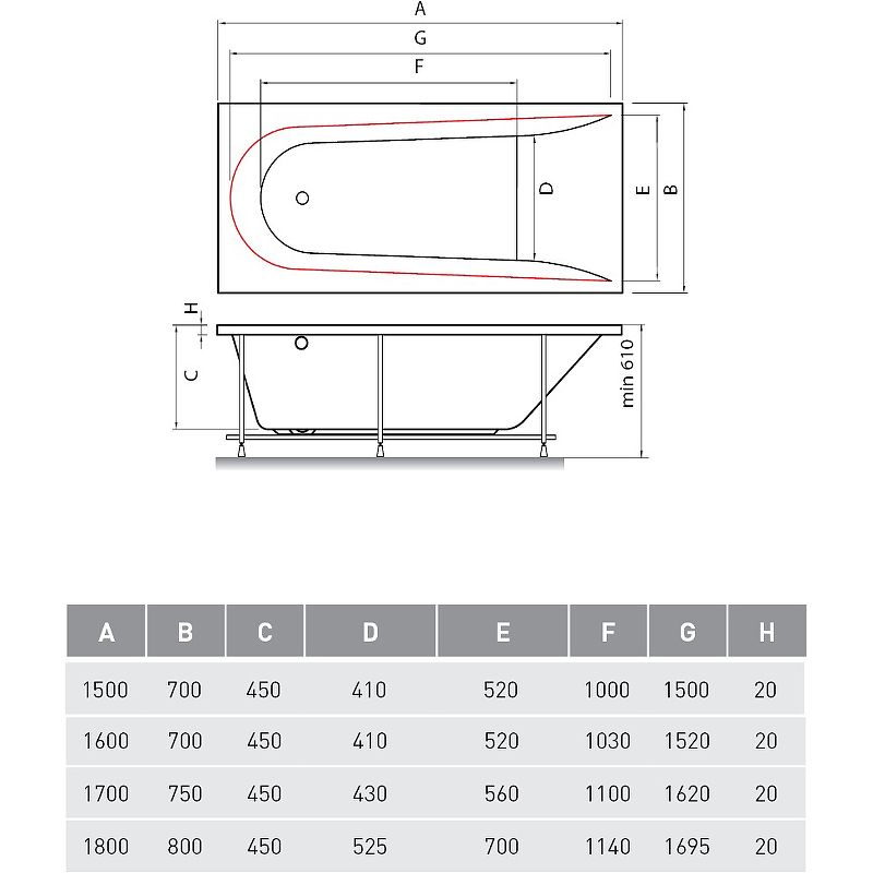 Высота ванны на каркасе: 61 см.