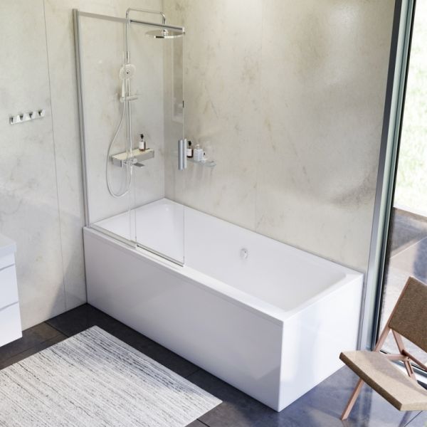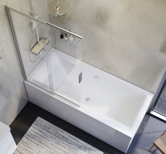 Раздвижная шторка на ванну из прозрачного стекла с профилем из алюминия цвета хром.