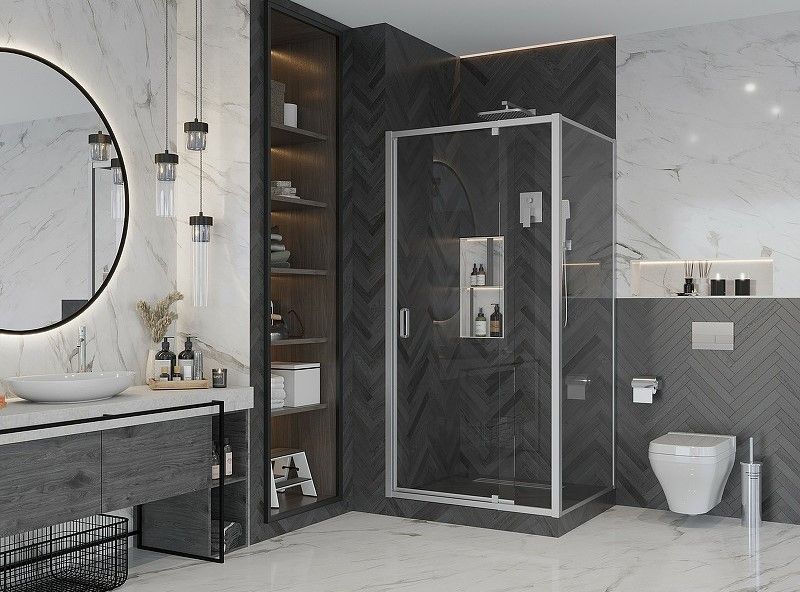 Это решение экономит место в ванной комнате. Также с помощью неподвижной стенки можно, например, отгородить стиральную машину, шкаф, раковину или унитаз.