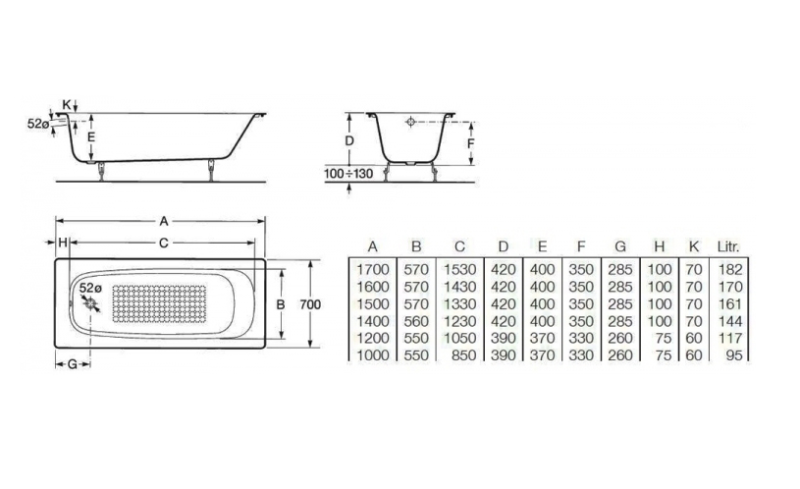 Стандартные размеры, см:170x70