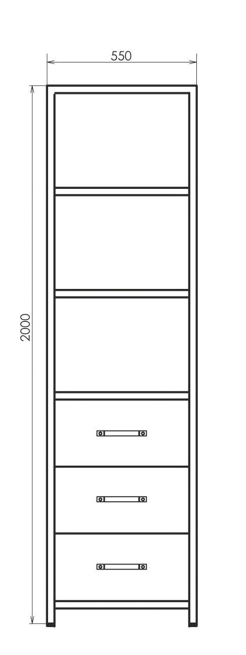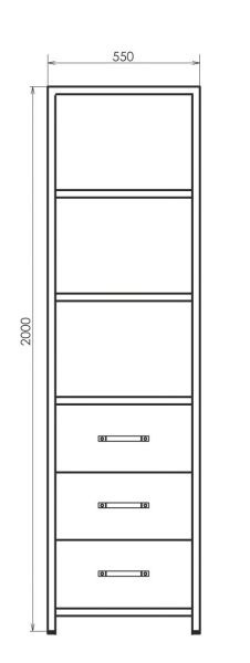 Напольная колонна с тремя выкатными ящиками, оснащёнными системой плавного закрывания и пространством для открытого хранения. В модели используется стальной профиль, покрытый чёрной матовой эмалью.