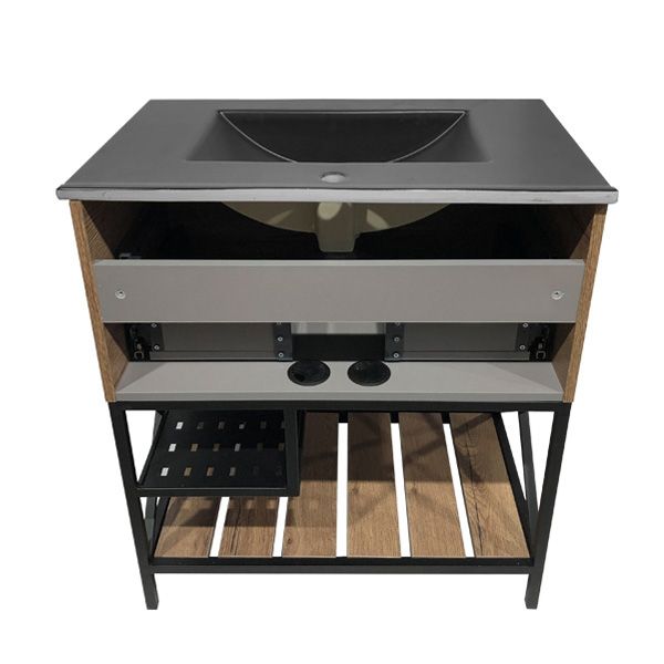 В комплекте черная матовая раковина с прямоугольной чашей. В основе тумбы - каркас из стального профиля окрашенный черной эмалью с нижней широкой полкой и средней полкой для полотенец. Стильная ручка ящика в том же цвете что и каркас. Тумба подготовлена для подключения водоснабжения снизу.