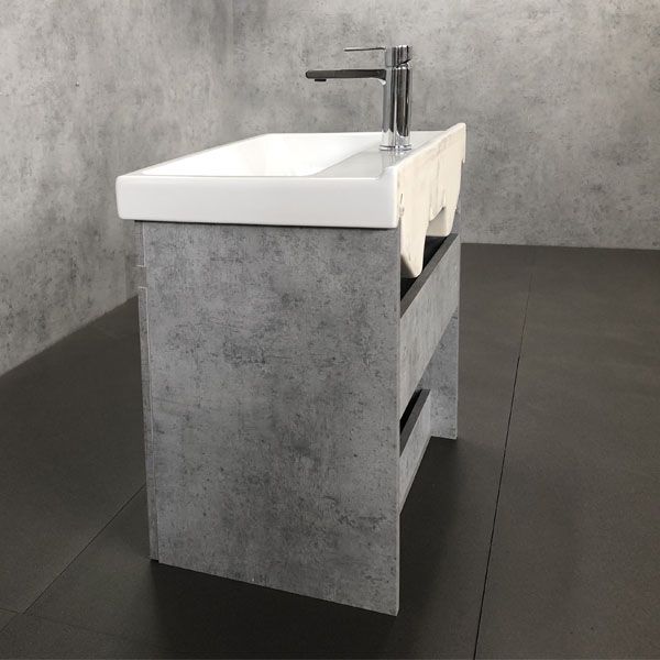 Подвесная тумба-умывальник с двумя распашными дверцами. Створки оборудованы петлями с механизмами плавного закрывания. Корпус и фасады из влагостойкого ЛДСП с декором "бетон светлый". Тумба укомплектована керамической раковиной и подготовлена к подключению коммуникаций из стены и из пола.
