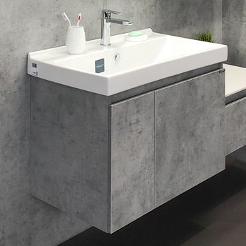 Подвесная тумба-умывальник шириной 80 см с распашной дверцей и глубоким выдвижным ящиком для хранения принадлежностей для умывания и бытовой химии. Петли створки и направляющие ящика оснащены механизмами плавного закрывания. Фасады и корпус из влагостойкого ЛДСП цвета бетон светлый.