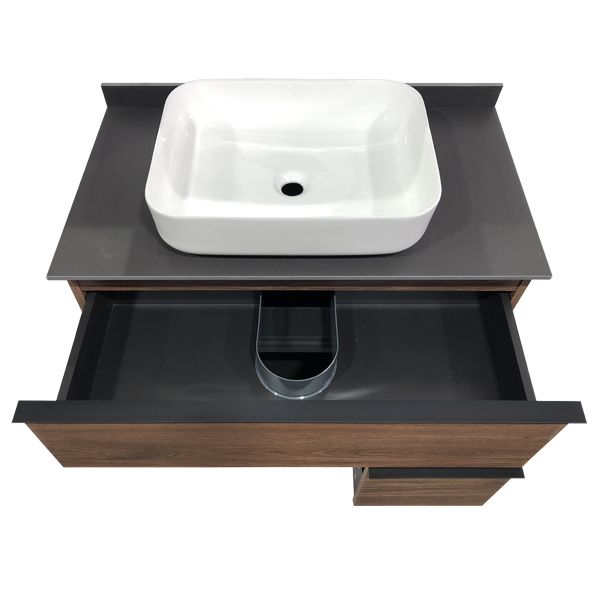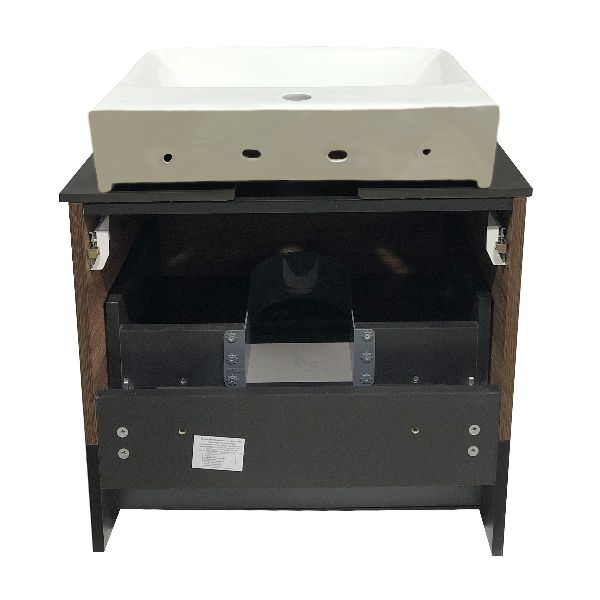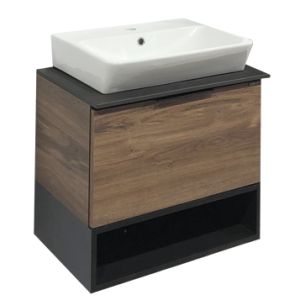 Тумба-умывальник в современном стиле с выкатным ящиком и пространством для открытого хранения. Ящик оснащен системой плавного закрывания. Тумба укомплектована черной матовой алюминиевой ручкой, столешницей из черного керамогранита и накладной прямоугольной раковиной из санфарфора. Тумба подготовлена для подключения водоснабжения снизу.
