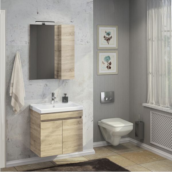 Название: Тумба-умывальник Артикул: Тромсе 60 Варианты цвета корпуса и фасада: Дуб Сонома Материал корпуса: влагостойкое ЛДСП Габариты (ШхВхГ): 600*630*400 мм Комплектация: раковина Fest 60 (санфарфор) Подвесная тумба с двумя распашными дверцами. Петли створок оснащены механизмами плавного закрывания.