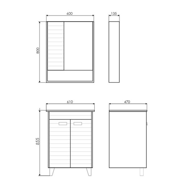 Створки оснащены петлями с плавным закрыванием. Левый узкий фасад из МДФ с фрезеровкой горизонтальными полосами. Правый широкий фасад - зеркальный. Высококачественное зеркальное полотно с амальгамой на основе серебра. Обе боковые створки шкафа открываются наружу. За широкой створкой две горизонтальные полки, за узкой одна. На нижней внешней полке можно расположить невысокие принадлежности для умывания.