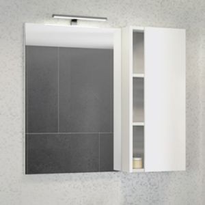 Название: Зеркало шкаф Артикул: Милан 90 Варианты цвета корпуса: Белый глянец Материал корпуса: влагостойкое ЛДСП Цвет фасада: Белый глянец Материал фасада: МДФ Габариты (ШхВхГ): 880*800*160 мм Зеркало-шкаф с одной створкой и пространствами для открытого хранения. Створка оснащена системой плавного закрывания. Две горизонтальные полки продолжаются и за створкой. Фасад покрыт белой глянцевой эмалью