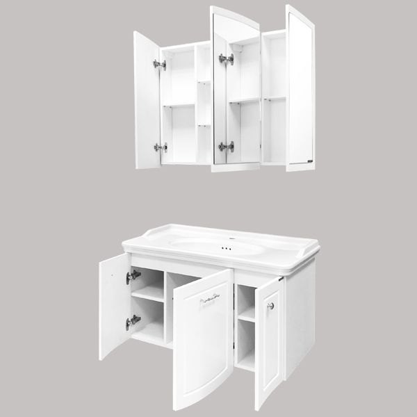 Створки оснащены петлями с плавным закрыванием. Высококачественное зеркальное полотно с амальгамой на основе серебра. Боковые стенки покрыты белой глянцевой эмалью. Две боковые створки открываются наружу, у центральной створки петли справа. Название: Шкаф-зеркало