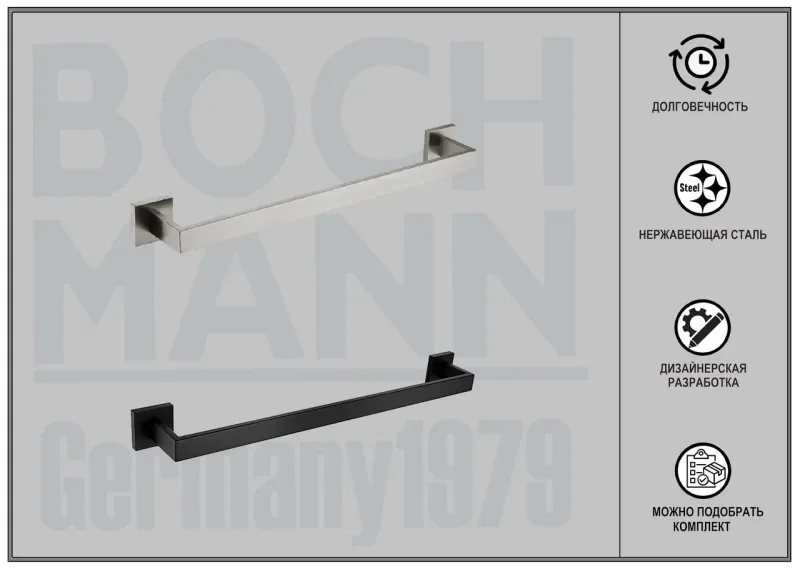 Ванная комната является одним из любимых и часто посещаемых мест человека. Мы проводим там больше 14 тысяч часов за всю жизнь, поэтому она обязательно должна быть не только уютной, но и эргономичной. Ни одна ванная комната не может обойтись без аксессуаров - незаметных на первый взгляд, но совершенно необходимых вещей, которые делают жизнь нашу намного комфортней. Они не только практичны, но и создают общую атмосферу ванной комнаты, придают ей индивидуальность и шарм.Дизайнерские аксессуары BOCH MANN стилистически завершают образ ванной комнаты, создавая целостную и продуманную концепцию. Их функциональный дизайн позволяет дополнить практически любой интерьер, а широкий ассортимент предоставляет свободу выбора. Так как срок службы аксессуаров для ванных и туалетных комнат напрямую зависит от материала, из которого они изготовлены, в производстве аксессуаров BOCH MANN используются только материалы самого высокого качества – нержавеющая сталь и закалённое стекло. Изделия из нержавеющей стали — рекордсмены по сроку службы, сохранению отличного внешнего вида и высоких эксплуатационных характеристик. Надежность конструкций аксессуаров BOCH MANN, профессиональное крепление и прочность покрытия позволяют использовать изделия не только в домашних условиях, но также и в общественных местах, включая отели и рестораны. Безупречность исполнения каждой детали, точность даже в мелочах — это признаки истинной элитарности бренда BOCH MANN. Преимущества:- эстетический внешний вид;- высококачественные материалы – нержавеющая сталь;- тип крепления – скрытый, отличающийся повышенной надёжностью;- два варианта цветов – классический черный и универсальный стальной;- чёткие формы каждой детали;- качество, проверенное годами. Внимание! Производитель оставляет за собой право вносить изменения в конструкцию и комплектацию моделей без предварительного уведомления!