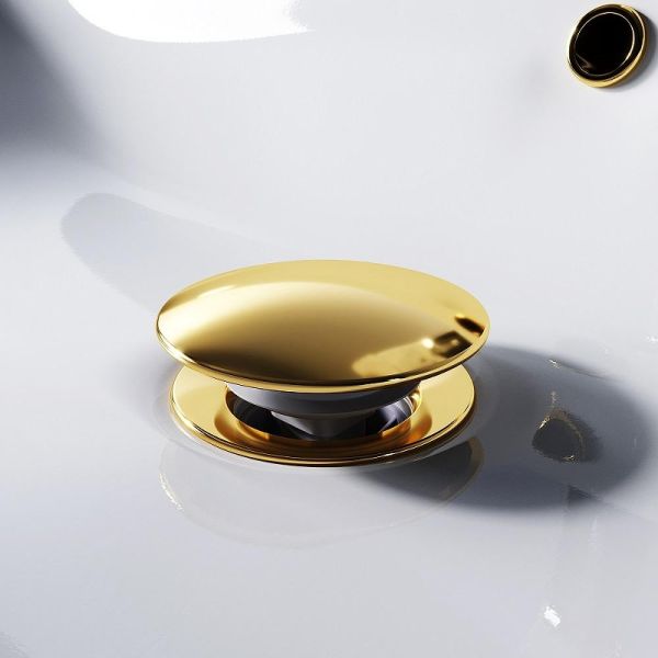 С отверстием для подключения перелива позволяющего выпускать воду из раковины при ее переполнении через отверстие в нижней части перелива. Система клик-клак управляется нажатием на пробку слива. Покрытие устойчиво к коррозии, появлению царапин, сколов и потускнению. Круглая заглушка в цвете золото. Подключение к сифону: G1 1/4
