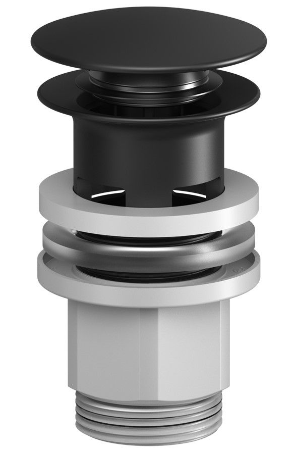 С отверстием для подключения перелива, позволяющего выпускать воду из раковины при ее переполнении через отверстие в нижней части перелива. Система клик-клак, управляется нажатием на пробку слива. Покрытие устойчиво к коррозии, появлению царапин, сколов и потускнению. Круглая заглушка черного матового цвета. Подключение к сифону: G1 1/4