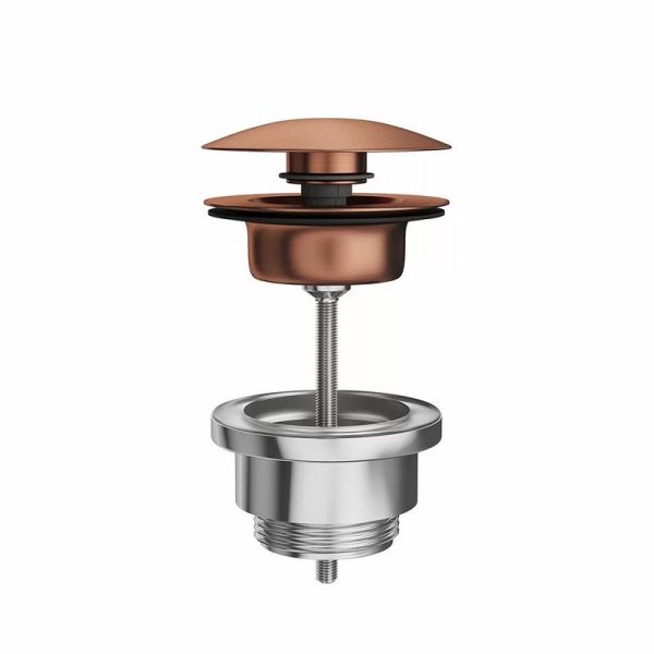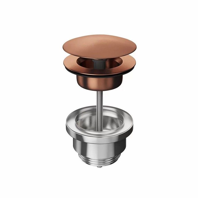 Донный клапан для раковины выполнен из нержавеющей стали AISI 316: этот металл обладает особой устойчивостью к механическим воздействиям, гипоаллергенен, не подвержен коррозии. Нажатие на клапан закрывает его, повторное нажатие открывает. Верхняя часть клапана выполнена с покрытием брашированная медь : это металлический слой, наносимый по технологии вакуумного напыления (PVD) и отличающийся высокой стойкостью.