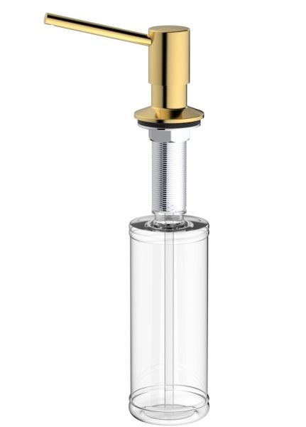 Дозатор встраиваемый для жидкого моющего средства Raglo R720.01.03 - отличный аксессуар для вашей кухни. Устанавливается в отверстие в столешнице Ф25 - 35 мм и фиксируется при помощи прижимной гайки на резьбе, рядом со смесителем для кухни. А со смесителями R80.62.03, R81.64.03, S70.61.03 составит прекрасный дуэт. Потому что выполнены они в одном цвете - сатиновое золото. Толщина столешницы возможна от 1 до 5 см. Головка дозатора из латуни, колба объемом 350 мл из прочного пластика. Нажатие мягкое, носик дозатора поворачивается на 360 градусов. Дозатор легко монтируется на столешницу и весьма удобно и просто происходит пополнение моющего средства. Дозатор превосходно организует пространство у мойки и несомненно украсит ее.