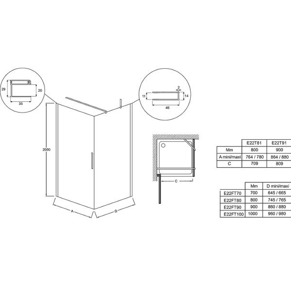 Душевая дверь Contra Black 90х200 E22T90-BL регулируется по ширине, снабжена магнитными замками и широкими стильными ручками.Технические данные:Профиль: черный.