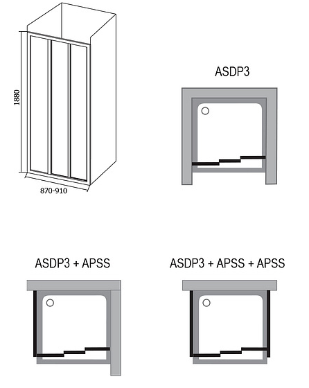 Изделие состоит из одной неподвижной части и двух подвижных частей. Повернув изделие на 180°, получите левый/правый варианты входа. Устанавливается в облицованный кафелем угол ванной комнаты на поддоны RAVAK ANETA, ANGELA, PERSEUS, PERSEUS PRO, PERSEUS PRO FLAT, PERSEUS PRO CHROME, GIGANT PRO, GIGANT PRO FLAT, GIGANT PRO CHROME или непосредственно на пол со встроенным душевым каналом или трапом. Комбинируя одну неподвижную стенку типа APSS с душевыми дверьми можно создать «Г»-образный душевой уголок. С помощью двух неподвижных стенок типа APSS и душевых дверей образуете «П»-образный душевой уголок. Возможно изготовление атипичных душевых дверей. Материал полотна двери: полистирол
