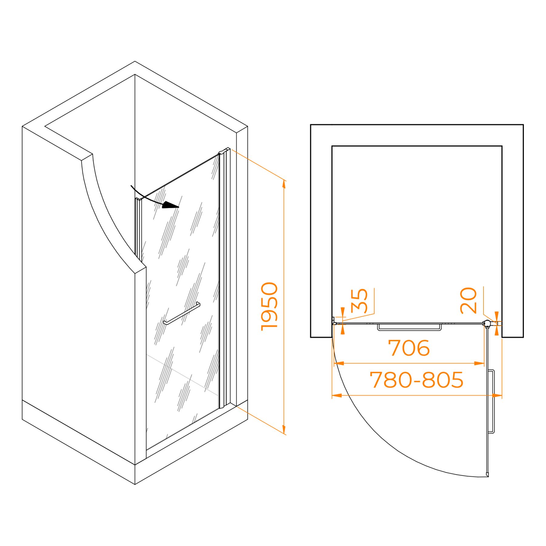 Душевая дверь распашная с маятниковой петлей (открытие только наружу). Маятниковые петли с функцией подъема двери. В комплекте нижняя пороговая планка. Стальная ручка - полотенцедержатель. Трап или поддон приобретается отдельно.